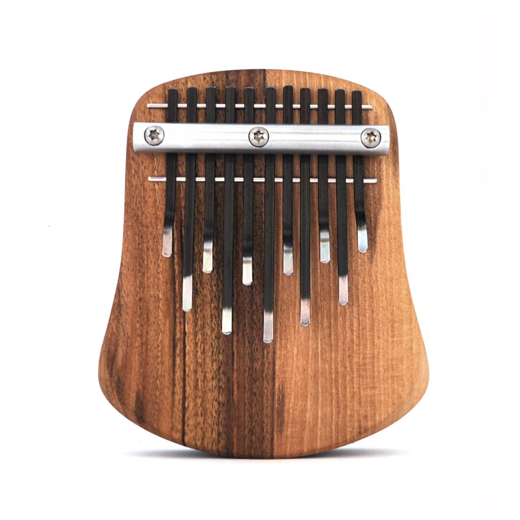 Ručně vyráběná 11-tónová kalimba PYRA umístěná na rezonanční desce, laděná v pentatonickém ladění G dur. Materiál: ořechové dřevo, matná kovová mechanika, jednořadé provedení lamel.